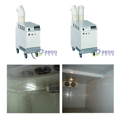 冷库加湿的方法较多,可采用地面洒水,也可将水以雾状微粒喷到空气中去,直接向空气加湿;也可直接喷于冷库地面或产品上,但效果并不理想;*简捷有效的方法就是配置相应的正岛ZS-40Z水果冷库保鲜库加湿机及ZS系列超声波喷雾加湿器,易于控制加湿量,绝不会出现加湿不足或滴水湿地的问题,冷库内湿度分布也均匀,而且应用广泛,可以为你达到很好的加湿效果和经济效益!